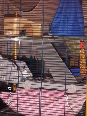 Doppelkäfig (zuerst, bis Momo kam, nur der untere Teil)... war recht praktisch, zum sauber machen einfach die Zwischentür dicht machen und schon hatte man keine Süßen überall laufen, ohne nen Auge drauf zu haben... Der Platz hat auch locker gereicht, auch noch als Fluffy kam, allerdings war die zu klein um vom unteren Teil in den oben zu klettern, oder auch einfach nur zu ängstlich.